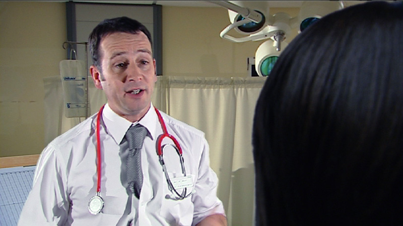 It was decided to use the comparative scenario of a mechanic baffling a young lady with technical chat when she brings her car into the garage with a fault. This scene is played out to a point where the lady is unsure what she is being told and what options she has. It is at this point that the scene in the garage morphs into a hospital location and the mechanic becomes a doctor. He continues his assessment of the situation using medical jargon, which just makes the lady more worried and unsure.